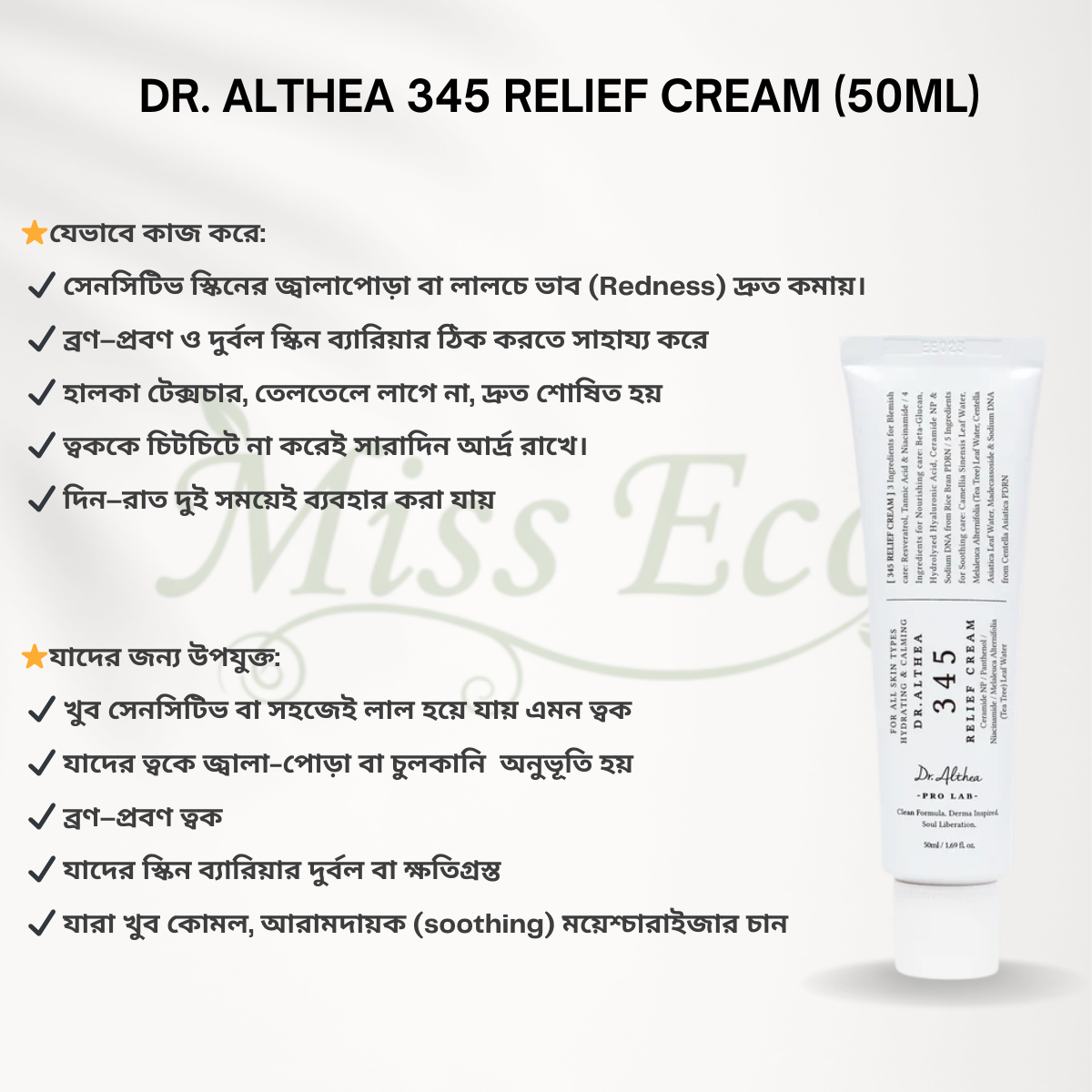 ✔ সেন্টেলা এক্সট্র্যাক্ট ত্বককে শান্ত রাখে এবং জ্বালা–পোড়া কমায়